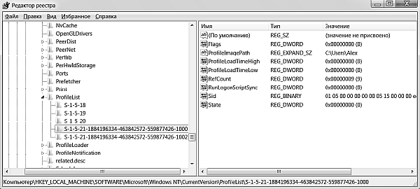 Также можно посмотреть раздел HKEY_LOCAL_MACHINE\SOFTWARE\Microsoft\Windows NT\CurrentVersion\ProfileList, который содержит список всех SID в виде подразделов. Просмотрите все подразделы и ищите в них параметр ProfilelmagePath. Ваш SID тот, в котором значение этого параметра совпадает с именем, под которым вы входите в систему (рис. 1.5).