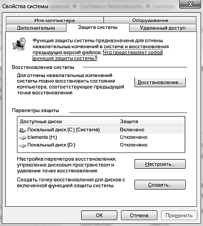 Для того чтобы создать точку восстановления системы, выполните команду Пуск ► Панель управления ► Система и безопасность ► Система ► Защита системы и в появившемся окне (рис. 1.7) нажмите кнопку Создать.