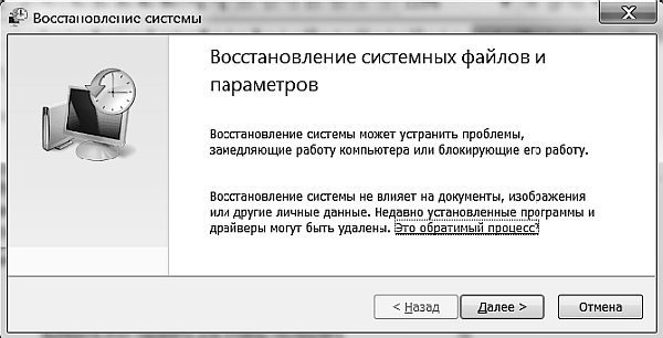 Окно Восстановление системы построено в виде мастера, который проведет вас по шагам, необходимым для запуска процесса восстановления.