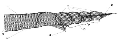 Рис. 1. Устройство современной мережи (для удобства изображено лишь одно крыло). 1 – наплавной шнур; 2 – грузовой шнур; 3 – крыло; 4 – дуга; 5 – катели; 6 – горло; 7 – бочка; 8 – кутец (куток).