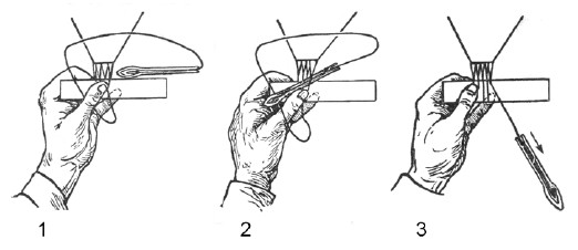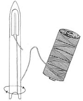 Для вязки сеток нужно сначала изготовить челнок из тонкой дощечки дерева вязкой породы (бука, вяза, берёзы и т. п.), а еще лучше – из листового металла, дюралюминия или латуни (рис. 3). На челнок наматывают нитки, как показано на рисунке (на каждом витке поворачивая челнок вокруг своей оси). Лучшие нитки – кручёные из искусственного волокна: капрона, нейлона и т. д.