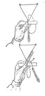 Сетку начинают вязать так: на расстоянии 10–15 см по горизонтали в стену вбивают два гвоздя длиной 50–75 мм и на них вешают верёвочное кольцо с подвязанной к нему нитью. Слегка натянув нить, накладывают ее на шаблонку сверху и, огибая шаблонку снизу, привязывают нить к верёвочному кольцу двумя-тремя узлами (рис. 4).