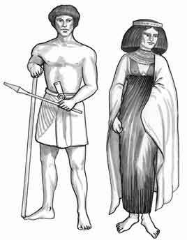 Жаркий климат Египта, собственно, не требовал никакой одежды, чем успешно пользовалось все население страны, от крестьян до фараонов. Египтяне додинастического периода (5000–2900 годы до н. э.) прикрывали наготу узкой полоской кожи, предположительно оставшейся от неведомой «моды» неолита. Труженики полей ограничивались связанными или сплетенными тростниковыми стеблями, получившими условное название «пояс с полоской». Знаком высокого положения служил парадный фартук из золотой парчи, созданный на основе пресловутого «пояса с полоской». Костюм знати дополняли посох и завитой парик, а военачальники всегда носили с собой жезл.
