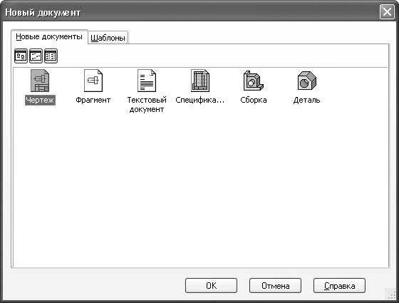 Как вы уже заметили, при первом запуске программы главное меню в верхней части окна содержит минимальное количество пунктов, а под меню находится всего лишь одна панель инструментов. С чего начинать освоение этой среды проектирования? Первым делом нужно выбрать тип создаваемого файла (тип документа). Типы документов могут быть разными, и их выбор производится в зависимости от того, что нужно пользователю: создать модель, чертеж, оформить спецификацию и т. п. Указать тип файла можно в окне Новый документ (рис. 1.2), для вызова которого следует выполнить команду меню Файл → Создать или нажать комбинацию клавиш Ctrl+N.