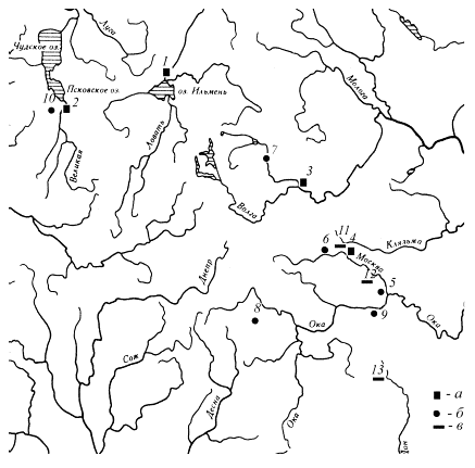 Рис. 1. Памятники, из которых происходят коллекции кузнечных изделий, отобранные для металлографического анализа (а – стольные города; б – малые города; в– селища. 1 – Великий Новгород; 2 – Псков; 3 – Тверь; 4 – Москва; 5 – Коломна; 6 – Звенигород Московский; 7 – Торжок; 8– Серенск; 9– Ростиславль Рязанский; 10 – Изборская крепость; 11 – Мякинино-1 и Мякинино-2; 12 – селище Настасьино; 13 – селища Куликова поля)