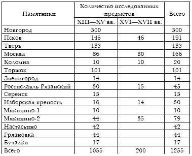 В настоящей работе аналитические материалы рассматриваются по трем группам памятников (рис. 1): стольные города (Новгород, Псков, Тверь, Москва), малые города (Звенигород, Торжок, Коломна, Ростиславль Рязанский, Серенск, Изборская крепость), сельские поселения (Мякинино-1, Мякинино-2, Настасьино, Грязновка, Бучалки). Всего в работе задействовано 1255 анализов (см. табл. 1). Аналитические данные, полученные авторами в последние пять лет (2000–2005 гг.), приводятся в Приложении. Авторы выражают искреннюю благодарность всем исследователям, любезно предоставившим материалы для аналитических работ.