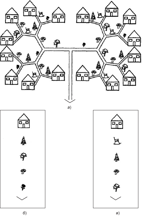 Методический материал: изображение полянок с разветвленными дорожками и домиками на их концах, а также «писем», условно указывающих путь к одному из домиков, помещенных под полянкой (см. иллюстрацию ниже). Вводные задачи состоят из двух задач – задачи «А» и задачи «Б». Решение каждой из задач проверяется экспериментатором. Далее следуют основные задачи. На рисунках к задачам 1–2 изображены только разветвленные дорожки и домики в конце них; на всех остальных каждый участок дорожки помечен ориентиром, причем в задачах 3–4 одинаковые по содержанию ориентиры даны в разной последовательности; в задачах 5–6 каждое разветвление помечено двумя одинаковыми ориентирами. В задачах 7-10 два одинаковых ориентира даны в разных последовательностях и расставлены не на отрезках пути, а в точках разветвления. На «письмах» к задачам 1–2 изображена ломаная линия, показывающая направление пути, по которому должен вестись поиск. В «письмах» к задачам 3–6 в определенной последовательности снизу вверх даны изображения тех предметов, мимо которых надо идти. В «письмах» к задачам 7-10 изображены одновременно и повороты пути (ломаная линия), и необходимые ориентиры.