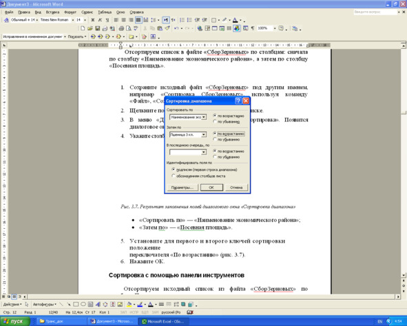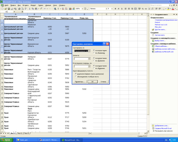 Отсортируем список в файле «Сбор Зерновых» по столбцам: сначала по столбцу «Наименование экономического района», а затем по столбцу «Пшеница 3 кл.». Для этого: сохраните исходный файл «Сбор Зерновых» под другим именем, например «Сортировка Сбор Зерновых», используя команду «Файл», «Сохранить как». Щелкните по любой ячейке в сортируемом списке.