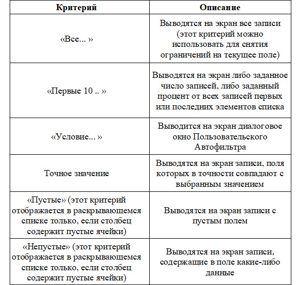 Выберите желаемый критерий. Список критериев Автофильтра приведен в таблице 1.3.1.