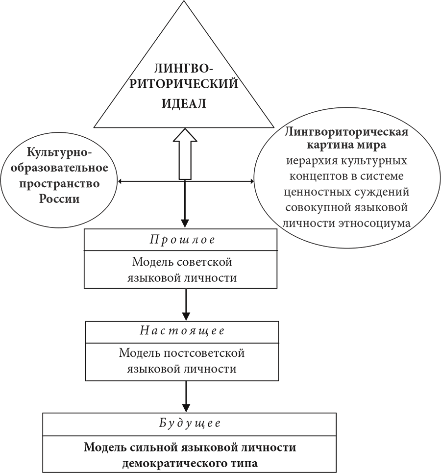 3. Специфика языковой ситуации в России ХХ в. обусловила социокультурную динамику типологических черт совокупной языковой личности – от «тоталитарной» модели (прошлое), к постсоветской (настоящее) и демократической (будущее). Современной модификацией отечественного ЛР идеала и адекватным стратегическим приоритетом нынешнего этапа образовательной политики правомерно считать идеальную модель сильная языковая личность демократического типа. Помимо высокой ЛР компетенции, этической ответственности за речевые поступки и экстралингвистической эрудиции, организованной на культурологической основе, ее характеризует социокультурно востребованная демократическая стратегия коммуникации: стремление к гуманизированным субъект-субъектным отношениям, конструктивному диалогу, широкой дискуссии с целью достижения согласия, принятия взаимоприемлемых решений, гармонизации общения. Педагогической доминантой становления такого «адекватного гражданина» является самопроектирование языковой личности с позиций ЛР идеала.