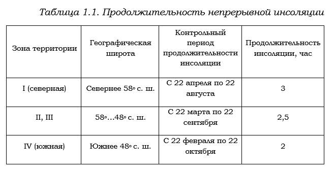 Инсоляция жилых помещений является одним из ведущих средств обеспечения гигиенических качеств, так как воздействие солнечного света губительно для большинства болезнетворных микробов и одновременно оказывает благотворное психофизиологическое воздействие на человека. Длительность инсоляции жилых помещений регламентирована в часах и зависит от климатических условий района строительство (табл. 1.1.). В застройке применяют дома, расположенные вдоль меридиана.