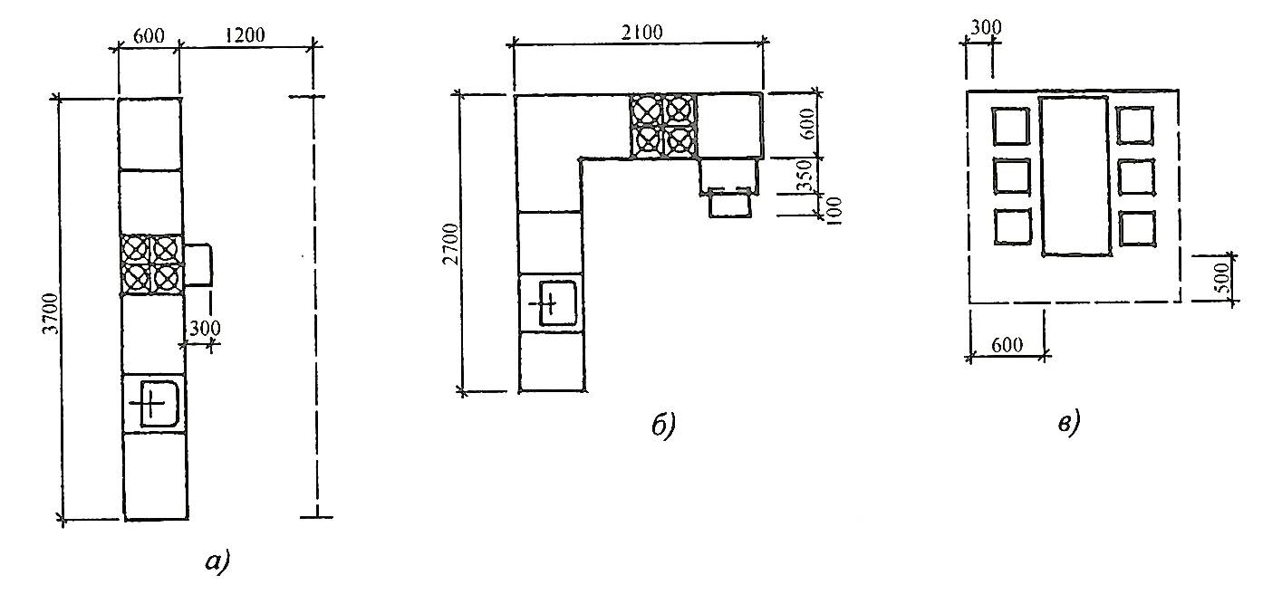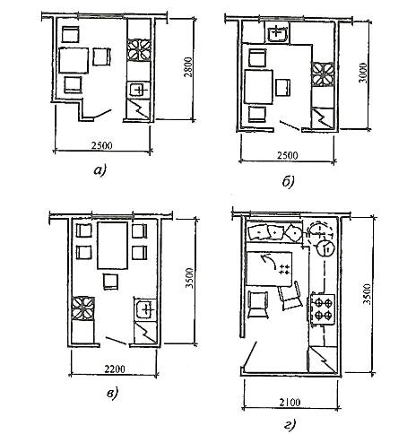 Рис 1.9. Варианты организации интерьера кухни: а) с однорядным расположением оборудования; б) угловым; в) двухрядным; г) с откидным столом