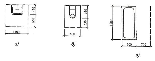 В домах с двумя уровнями устраивают два санузла. На первом этаже – туалет, на втором – ванная, совмещенная с туалетом. Минимальная площадь туалета 1,5…2 м2, ванной – 4 м2. Внутренние размеры ванной должны быть не менее 1,4х1,72 м, а туалета – не менее 0,8х1,2 м. Двери уборной, ванной и санузла должны открываться наружу. Не допускается располагать уборную и ванную непосредственно над жилыми комнатами и кухней. Размещение уборной и ванной (или душевой) над кухней допускается в квартирах, расположенных в двух уровнях. Вход в помещение, оборудованное унитазом, непосредственно из кухни и жилых помещений (кроме жилых помещений, предназначенных для семей с инвалидами) не допускается. Не допускается крепление приборов и трубопроводов непосредственно к межквартирным стенам и перегородкам, ограждающим жилые комнаты. Основные типы и размеры санитарных узлов приведены на рисунках 1.10., 1.11.