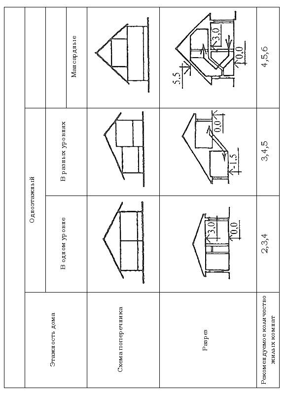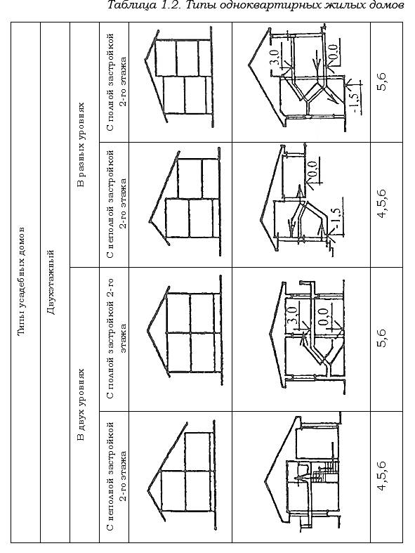 Одноквартирные жилые дома могут быть одно- и двухэтажными (в том числе мансардными). В зависимости от этажности их сводят к нескольким типам (табл. 1.2.). Дома могут иметь также подвальные, цокольные и мансардные этажи.