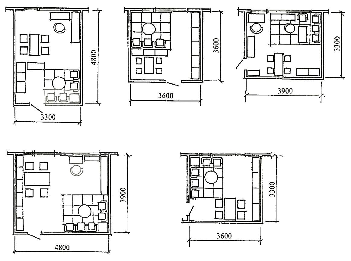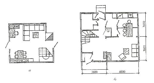 Общая комната (рис. 1.2., 1.3.) площадью, равной 6-24 м2 (шириной не менее 3 м), может иметь две функциональные зоны: отдыха и обеденную. В зоне отдыха размещают мягкую мебель, телевизоры, шкаф для книг; в обеденной – стол, стулья, шкаф для посуды. Последнюю располагают ближе к двери в кухню. Функциональные зоны разделяют расстановкой мебели, размещением светильника, ковром на полу. Общую комнату делают как изолированной, так и проходной. Она должна просматриваться из передней. Для этого дверь из передней обычно делают двухстворчатой остекленной. Общую комнату непосредственно связывают с передней. Допускается проектировать проход в спальню через общую комнату.