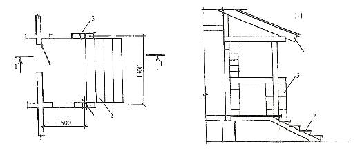 Крыльцо – это открытая площадка с несколькими ступенями (рис. 1.18.), устраиваемая перед входом в жилой дом. Ширину крыльца принимают не менее полуторной ширины входной двери. Ступени делают шириной 270…300 мм, высотой 150 мм и длиной 1200…1500 мм.