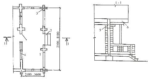 Рис. 1.19. Пример решения террасы: 1 – площадка входа; 2 – ступени; 3 – ограждение; 4 – окно; 5 – стена дома; 6 – крыша