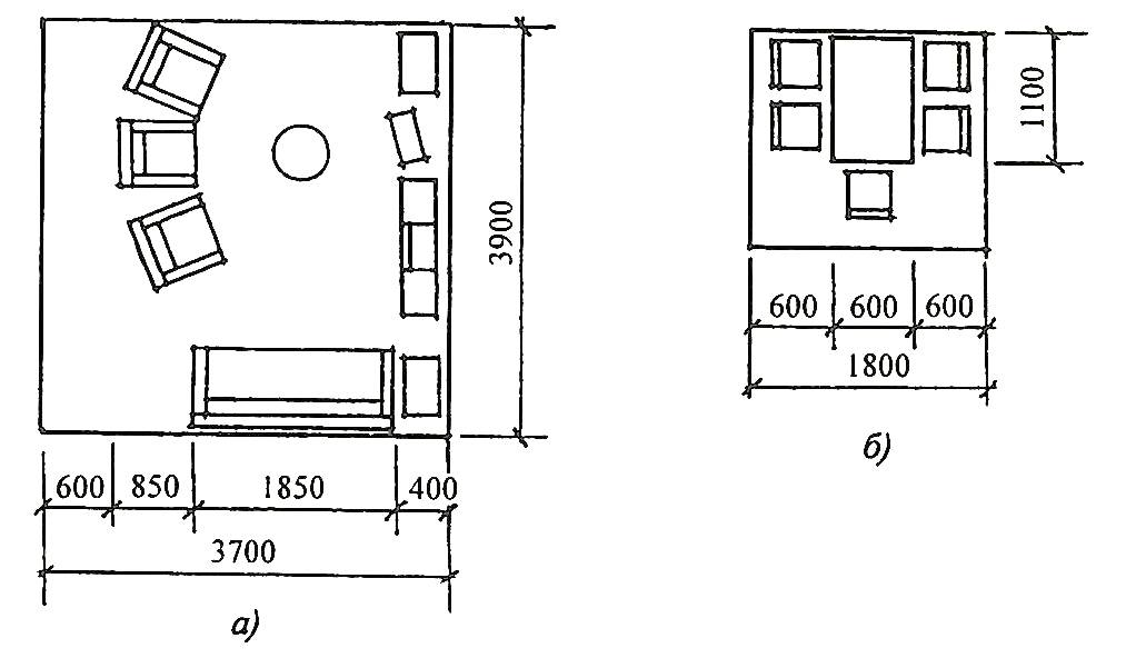Рис. 1.2. Минимально необходимые размеры общей комнаты: а) с телевизором; б) с обеденным столом