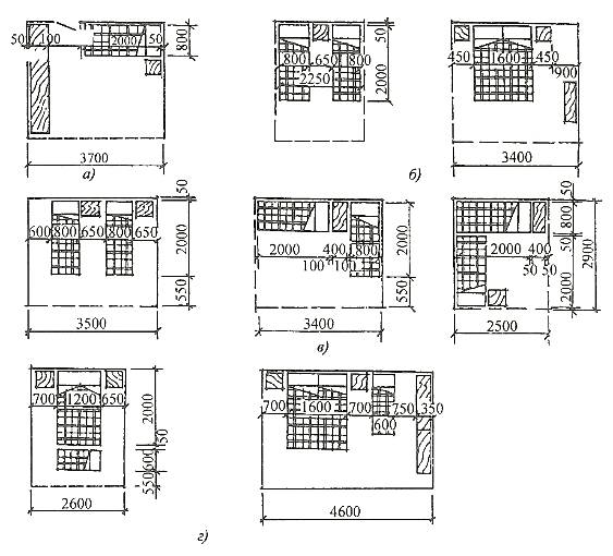 Рис. 1.4. Минимально необходимые размеры спальной комнаты: а) для одного человека; б) для супружеской пары; в) для однополых детей; г) для супругов и ребенка до трех лет