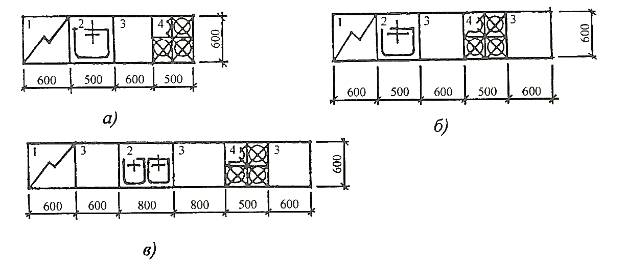 Рис. 1.7. Примерный набор кухонного оборудования: а) для семьи из одного – двух человек; б) трех – четырех человек; в) пяти человек; 1 – холодильник; 2 – мойка; 3 – рабочий стол; 4 – плита