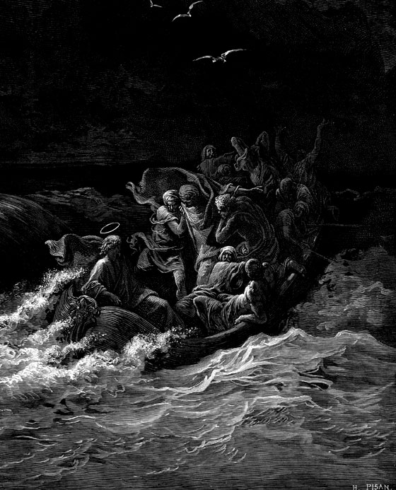 Однажды Иисус Христос плыл со Своими учениками в лодке по Галилейскому озеру. И случилась страшная буря: подул сильный ветер и поднялись большие волны. Лодку раскачивало и заливало водой. Иисус Христос в это время лежал на корме и спал. Буря становилась все сильнее и сильнее, все труднее было управлять лодкой. Казалось, еще раз или два дунет ветер – и опрокинет лодку, еще одна большая волна – и лодку зальет, пойдет она ко дну, и все утонут. Ученики сильно испугались и не знали, что делать. Наконец они разбудили Иисуса Христа и сказали: «Учитель! Неужели Тебе и нужды нет, что мы тонем? Спаси нас, погибаем!»