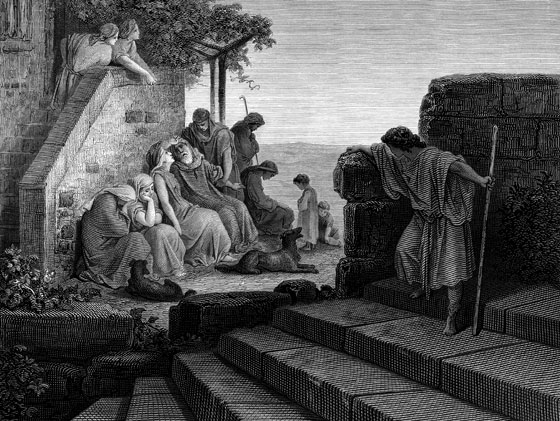 Каждый день он имел отличный обед и ужин. Какие вкусные кушанья подавались к его столу! Много разных дорогих вин ставили на стол, когда богач садился обедать, ужинать или завтракать. Сколько у него собиралось гостей, с которыми он ежедневно пировал! А в это время у ворот его дома весь в струпьях лежал один нищий по имени Лазарь. Этот голодный бедняк рад был объедкам, которые оставались от стола богача и выбрасывались вон. Возле этого несчастного, который едва мог сдвинуться с места, бродили собаки и лизали его раны.