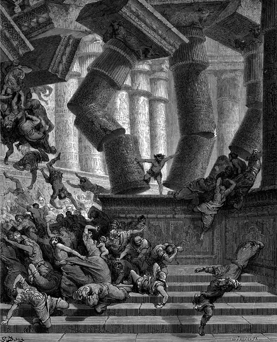 Однажды у филистимлян был большой праздник. Собрались все филистимские князья и много, несколько тысяч, народу. Пришли они все в один большой дом и начали пировать. Вдруг вздумалось им привести Самсона, чтобы посмеяться над ним. Позвали Самсона, начали над ним потешаться, заставляли играть и били его по щекам. Наконец это им надоело. Самсона поставили между столбами, а сами продолжали веселиться.