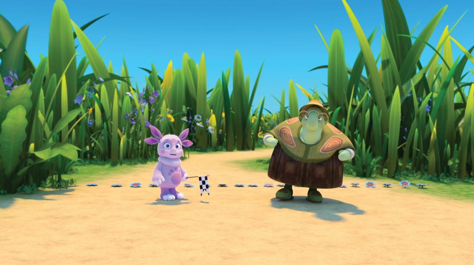 Друзья выложили синими цветочками линию старта, а розовыми – линию финиша. Луна решила устроить игровой забег на скорость с черепахой тётей Мотей! В их турнире Лунтик был судьёй. Он взмахнул флажком, и соревнование началось. Конечно же, когда Луна прибежала к финишу, тётя Мотя успела отойти от старта всего на пару шагов. Эта игра оказалась совершенно неинтересной.