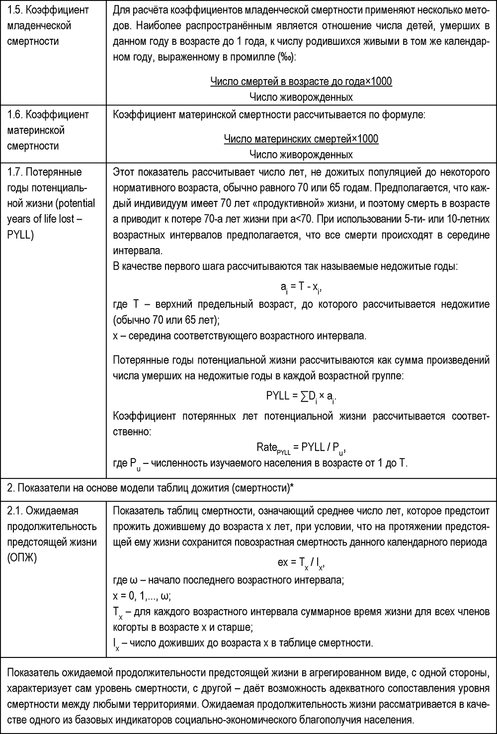 Характеристика собственно здоровья популяции основывается на знаниях о её заболеваемости, инвалидности, а также величине и причинах смертности, вероятности дожития до определённого возраста, ожидаемой продолжительности жизни при рождении и т. д., при этом используются как общие, так и половозрастные показатели (табл. 1.2).