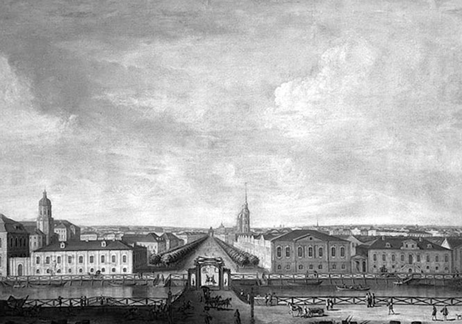 В пути супружескую пару сопровождали друзья и свита. Позади осталась ещё совсем маленькая по европейским масштабам русская столица с деревянными в своём подавляющем большинстве постройками и плохо замощёнными улицами. В начале Невской першпективы, у Зелёного моста через Мойку, возвышалось над другими примечательное каменное (кирпичное) здание, кстати дошедшее до нас, – Строгановский дворец. У Екатерининского канала стояла тоже каменная, но с деревянными куполом и звонницей церковь Рождества Пресвятой Богородицы (рис. 2). Она была выстроена по велению и на средства Анны Иоанновны и освящена 13 июня 1737 года. В ней хранилась святыня Дома Романовых и России – Казанская икона Божией Матери. Проект собора приписывается М. Г. Земцову Однако В. В. Антонов и В. К. Шуйский пишут, что его авторство ждёт своего подтверждения, в архивных материалах фигурирует имя ученика Земцова И. Я. Бланка (Антонов и др., с. 16).