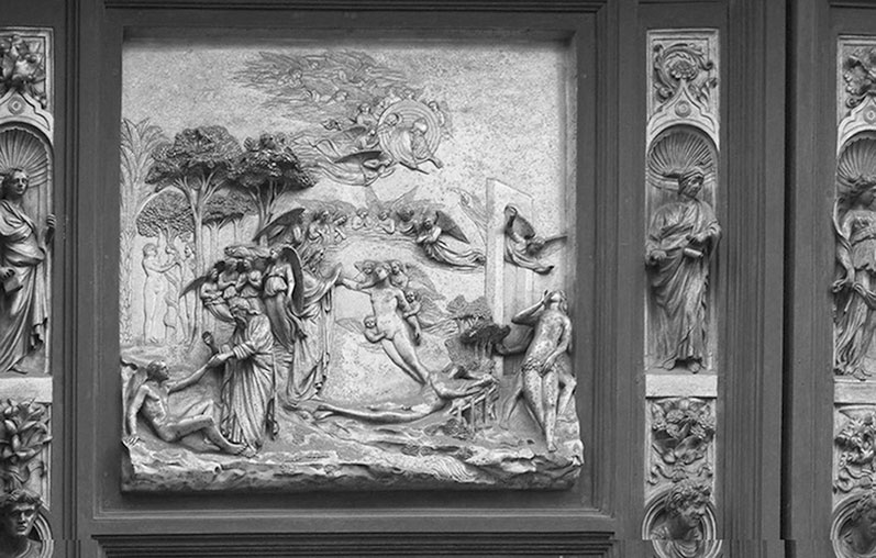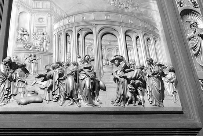 Из Рима великокняжеская чета отправилась во Флоренцию. Над городом уже тогда господствовал громадный купол собора Санта Марии дель Фьоре (Св. Марии с цветком), созданный по проекту Брунеллески. Рядом высилась многоярусная стройная кампанила Джотто. Всех восхищал восьмигранный баптистерий (вкл., ил. 2а), а особенно – его восточные позолоченные громадные двери с десятью рельефами, изображающими сцены из Ветхого Завета (рис. 6; вкл., ил. 2б), исполненными Гиберти в 1425–1452 годах. Микеланджело назвал их Райскими Вратами. Граф Северный решил воспроизвести эти врата в задуманном им новом петербургском храме.