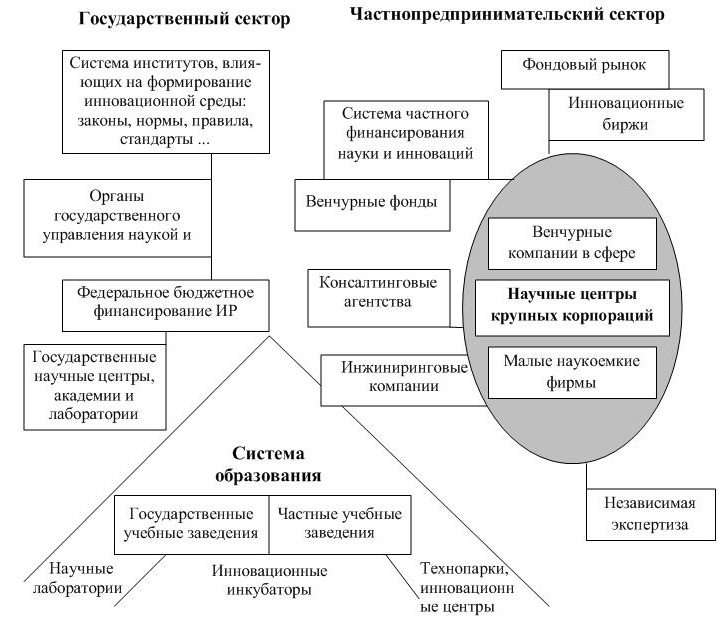 Ключевое значение среди институтов, формирующих национальную инновационную систему, имеют институты защиты интеллектуальной собственности, которые создают основу для управления инновациями как объектами интеллектуальной собственности, и институты инновационной инфраструктуры, создающие благоприятную среду для осуществления инновационных процессов.