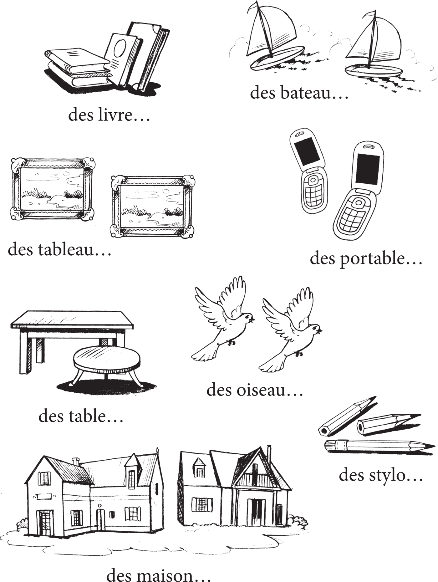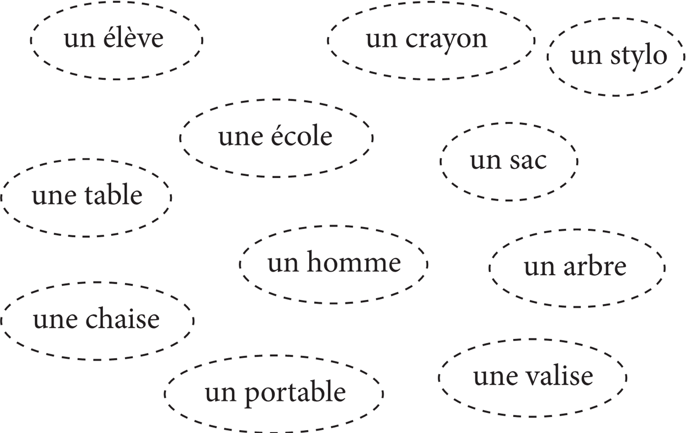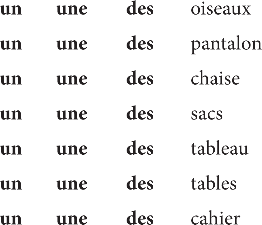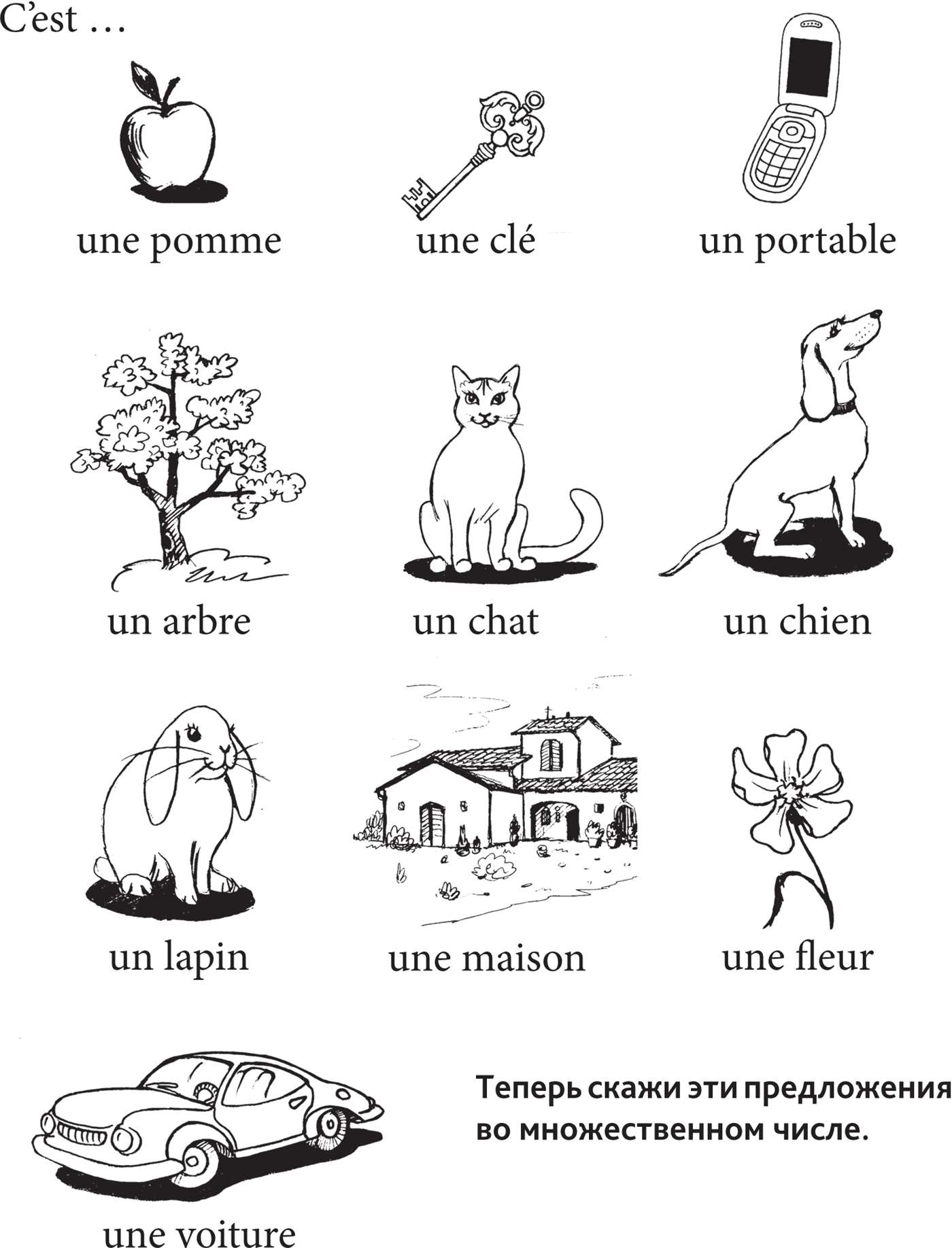 ⧫ Сделай подписи к рисункам и напиши существительные с неопределённым артиклем un, une, des.