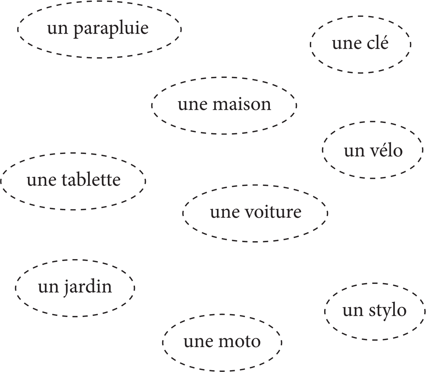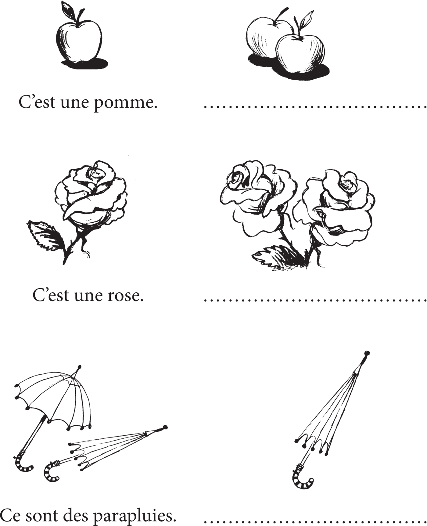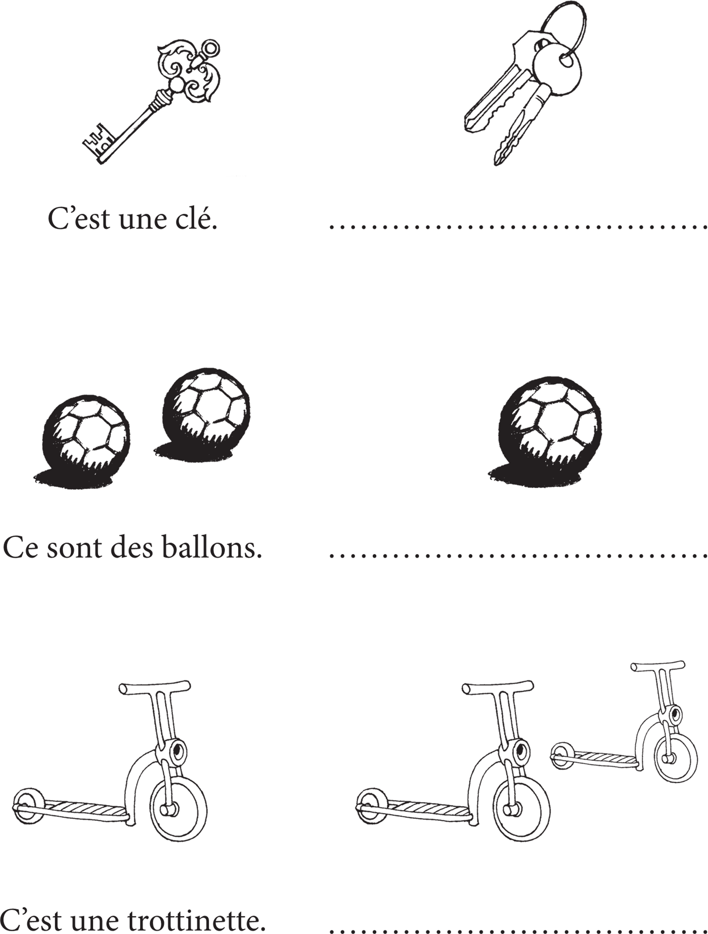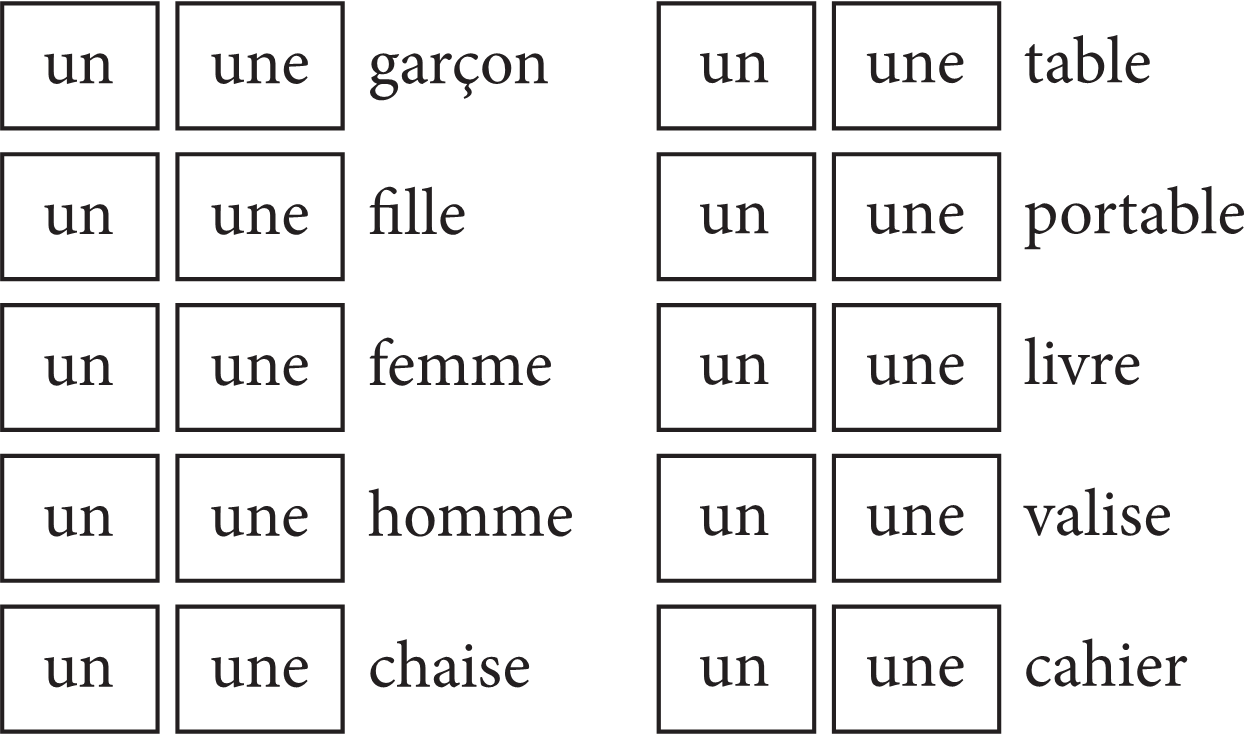 ⧫ Сделай подписи к рисункам и напиши существительные с неопределённым артиклем un, une, des.