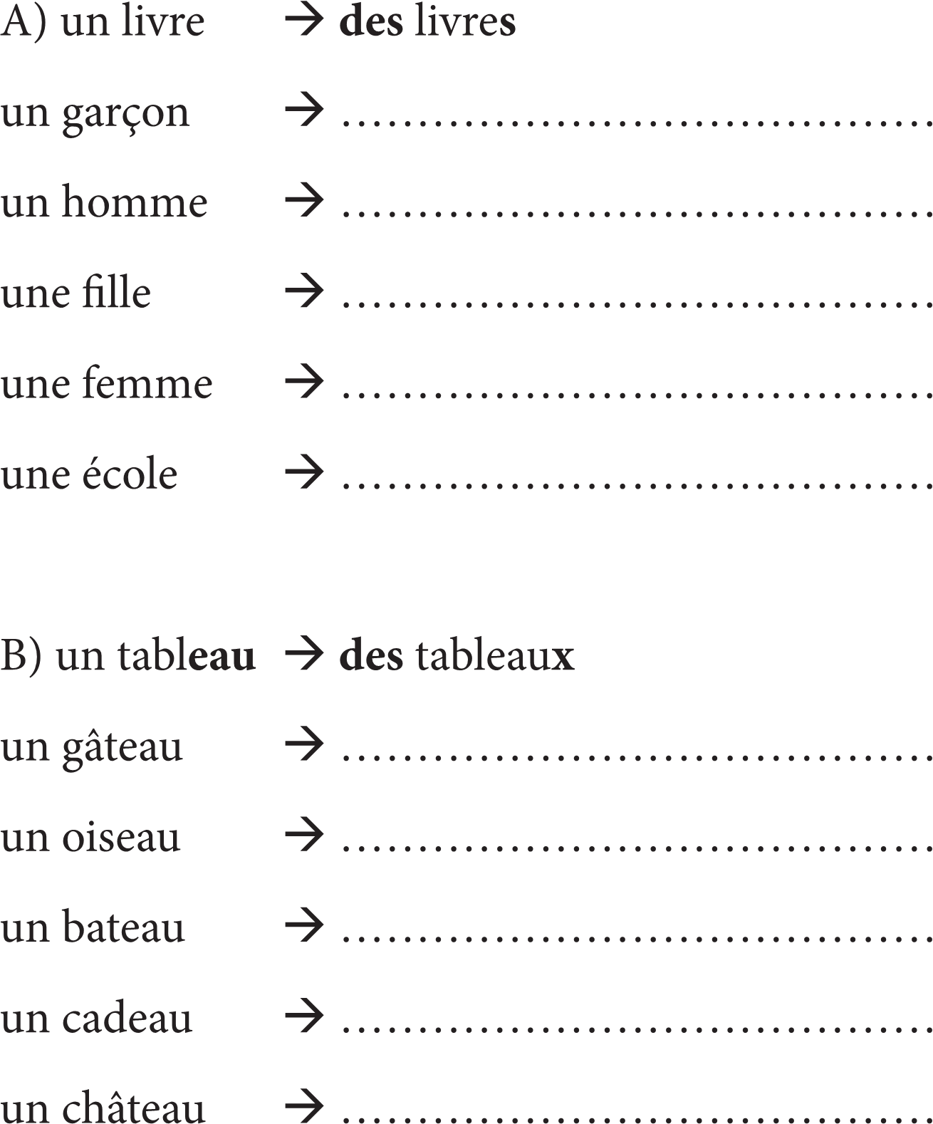 Теперь поставь эти слова во множественное число и замени их местоимением ils или elles.