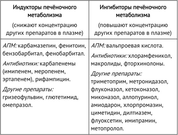 Фенитоин, фенобарбитал и карбамазепин индуцируют ферменты CYP и UGT. Ламотриджин является слабым индуктором UGT. Вальпроат является ингибитором ферментов UGT широкого спектра действия, эпоксидгидролазы и ферментов CYP2C. Фелбамат индуцирует CYP3A4, но ингибирует субстраты CYP2C19. Топирамат ингибирует только субстраты CYP2C19. Этосуксимид, габапентин, тиагабин и вигабатрин не являются ни индукторами, ни ингибиторами метаболизма лекарственных средств. Ингибирование печеночных ферментов обычно происходит из-за конкуренции в месте действия фермента [42].