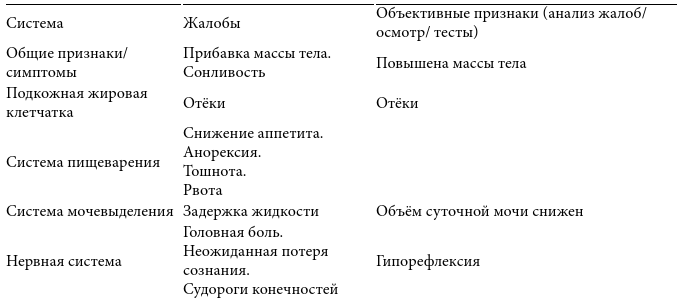 • нарушением экскреции воды с понижением объёма выделяемой мочи, что приводит к повышению объёма циркулирующей жидкости и к нарушению осмолярности плазмы.