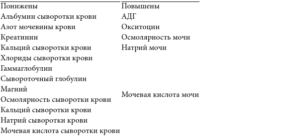 В табл. 7.16 представлены изменения биохимических показателей при СНАДГ, из которых диагностически значимы в клинике гипоосмолярная гипонатриемия в сочетании с максимально концентрированной мочой (осмолярность более 300 мОсм/л). Уровень АДГ непропорционально высокий по отношению к осмолярности, но при этом может быть и в нормальных пределах.