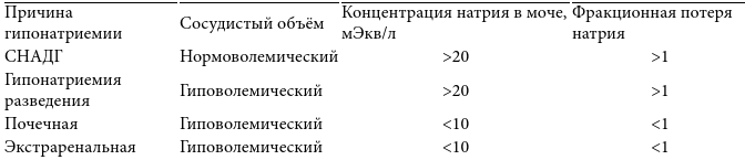 Составляет некоторую проблему дифференцирование эуволемического состояния от гиповолемического с сопутствующей потерей натрия с мочой (почечный солевой диабет), так как концентрация натрия в моче и фракционная экскреция натрия идентичны в обоих случаях (табл. 7.18). Один из способов дифференцировать эти состояния – вводить 2 сут (48 ч) 0,9 % раствор натрия хлорида со скоростью 1 л/24 ч. Это улучшает показатели гипонатриемии >5 мЭкв/л преимущественно при гиповолемии. У больных с СНАДГ не наблюдают изменения концентрации натрия или, по крайней мере, его содержания <5 мЭкв/л. С другой стороны, ограничение жидкости до 600–800 мл/сут в течение 2–3 дней улучшает содержание натрия в крови (компенсирует гипонатриемию) при СНАДГ, но не при почечном солевом диабете.