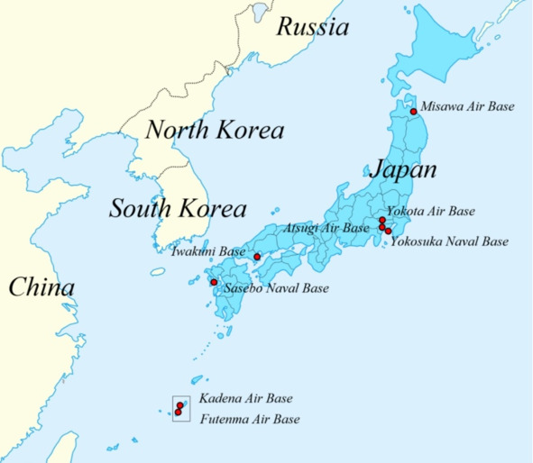 Такие базы, как Ацуги и Мисава, находятся на основных Японских островах. Всего на Хонсю, Кюсю и Окинаве расположен 91 объект США. Они занимают 78 000 акров территории. Американская инфраструктура на Окинаве: Наибольшее количество американских баз расположено на островах Рюкю, а конкретнее на о. Окинава (префектура Окинава) – примерно 74,7% всех военных объектов США в Японии расположены на острове Окинава. От 50 до 75% (25,8 тыс. американских военнослужащих и 19 тыс. членов их семей и гражданских лиц США) войск США в Японии расквартированы на Окинаве. Площадь баз составляет около 18% от территории острова Окинава. Военные объекты США занимают около 10,4% от общего объёма пригодных для размещения территорий. В настоящее время на территории префектуры дислоцируются 14 американских военных баз; крупнейшими считаются: Авиационная станция МП США Футенма – расположена в густонаселенном городе Гинован.