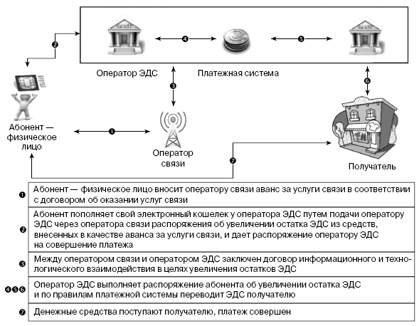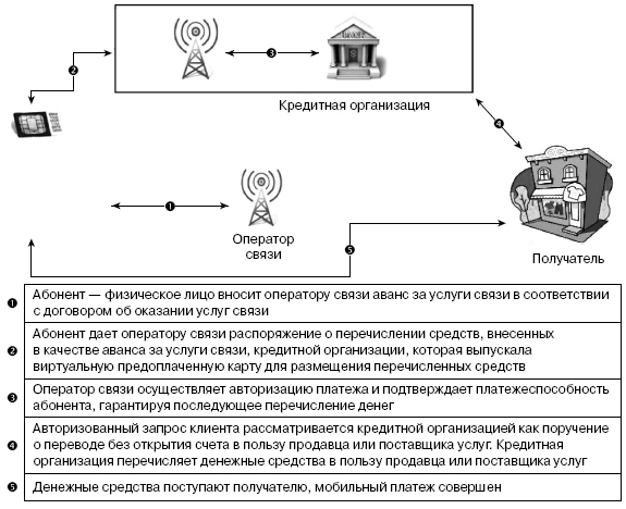 Платеж проводился с использованием мобильного телефона следующим образом. Оператор связи по распоряжению абонента возвращал ему аванс за услуги связи. Кредитная организация выпускала виртуальную предоплаченную карту, на которую перечислялся указанный аванс. В дальнейшем эта предоплаченная карта использовалась для оплаты товаров и услуг. Оператор связи осуществлял авторизацию платежа, т. е. осуществлял идентификацию плательщика по реквизитам SIM-карты и, поскольку платеж производится за счет средств абонента за услуги связи, подтверждал его платежеспособность, гарантируя последующее перечисление денег. Авторизованный запрос клиента рассматривался банком как поручение о переводе без открытия счета в пользу продавца или поставщика услуг и исполнялся в момент поступления в банк соответствующих средств абонента от оператора[12]. Указанная схема выглядит следующим образом (рис. 2.5).