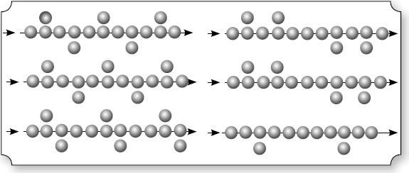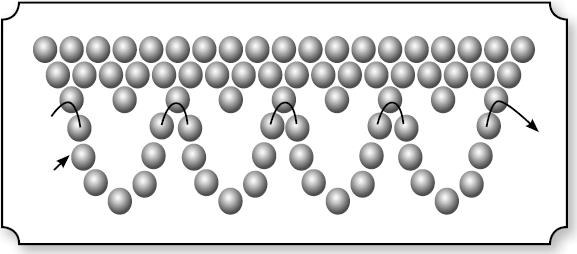 Вариантов соединения цепочек очень много. Их можно соединять по всей длине или через определенные промежутки, закрепляя нить, а затем вплетая ее вновь либо двигаясь через крайние бисерины цепочек и набирая на нить бисер, соединяющий ряды (рис. 32).