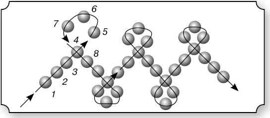 Цепочка «зигзаг» может быть с бугорками. Набери семь бисерин, пройди через бисерину 4, далее по схеме (рис. 11).