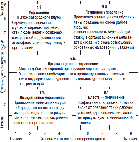 1:9 – управление в духе загородного клуба («дом отдыха»), руководитель сосредоточивается на хороших, дружеских взаимоотношениях с подчиненными, но мало заботится об эффективности выполнения заданий;