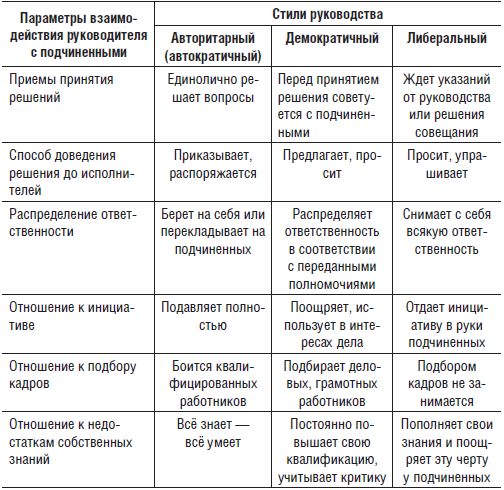 Таблица 4. Характеристика основных стилей руководства