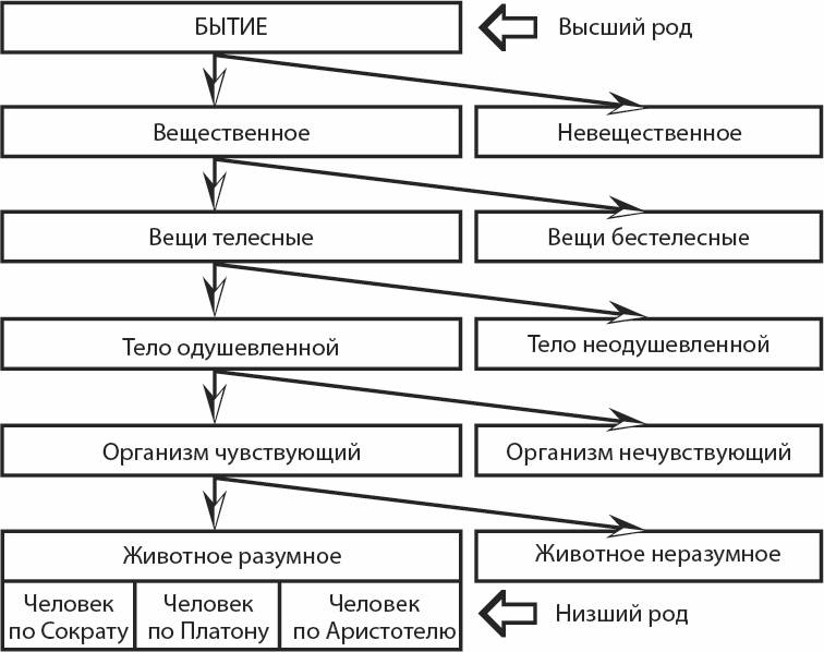 «В логике с именем Порфирия связано так называемое “древо Порфирия”, иллюстрирующее многоступенчатую субординацию родовых и видовых понятий при дихотомическом делении».7 Вот пример «Древа Порфирия», в котором представлено нахождение содержания философского понятия «человек» путем бинарных последовательных шагов от самого высокого понятия (род) с помощью исходящих от родов видовых понятий: