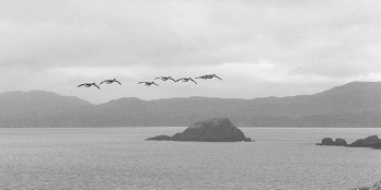 They are as innocent and flighty as deer. The flock moves in its grazing like a shoal, a turn of a few degrees communicated somehow at the same instant throughout the pack. There is an ever-present suggestion of a tremor even in the way they stand and walk. But for all the beauty of that sight, that million-fingered responsiveness, this land-life on the grass seems to be no more than an interruption to their favoured state. They belong in the air. Lift yourself for a moment, so that more than your eyes and hat appear above the geese’s horizon and it is as if you have blown a breath of wind across the flock. The four hundred of them rise and shimmer like a single piece of cloth lifted by the breeze. The edge of the crowd nearest you moves first, and that beautiful supple sheet of the rest of them follows on with the same ripples in their white heads and black necks, the same slow crooner’s elasticity in the muscles, and same ineffable languor, all synchronised as if tied by invisible threads. A human crowd, suddenly made aware of a threat or danger, would shatter, each shard dispersing as if shot. The flock of geese does the opposite, more whole in the air than it had been on the ground, turning on the wind, a single wing, before beating out over the Minch, down over the small, grassless rock at the southern tip of Eilean an Tighe, Sgeir Mianish (‘the rock of the middle headland’ in Gaelic-cum-Norse) before flogging over into the wind to the equally inviting grass on Eilean Mhuire, a mile and a half away to the east, a coughing, guttural chatter as they pass.