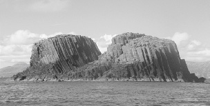 I rowed the boat around, slipped easily through the natural arch at the corner of Garbh Eilean, where, every time you pass, a black guillemot drops out of the cracks in the ceiling on to the sea and then panics and flusters away to the north. The boat slides out across the liquid glass of the Minch. The seals asleep on the skerries wake, stare, shuffle seawards and plunge horrified into the water. The boat rounds the corner of those rocks and then the Shiants reveal their heroic heart. A curtain of columns half a mile long, five hundred feet high and each column up to eight or nine feet wide, drops into the Minch. The black lichen of the splash zone coats them to a height of a hundred feet or more. They bend slowly as they rise from the sea, a wonderful subtle elasticity in the mass. On calm days you can take a dinghy right up to the cliff foot, the boat just nosing and brushing at the giant forms. Afloat on the ink of the green sea, it is like being in the elephant house at the zoo, intimate with hugeness, pushed up next to a herd of still, alien, unembraceable bodies.