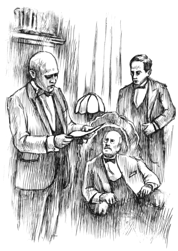 Çox keçməmiş o qayıdıb gəldi. Əlində bir şüşə viski var idi. Cəld qədəhləri doldurdu. Bu vaxt həkimlə cənab Rocers də salona qayıtdılar.