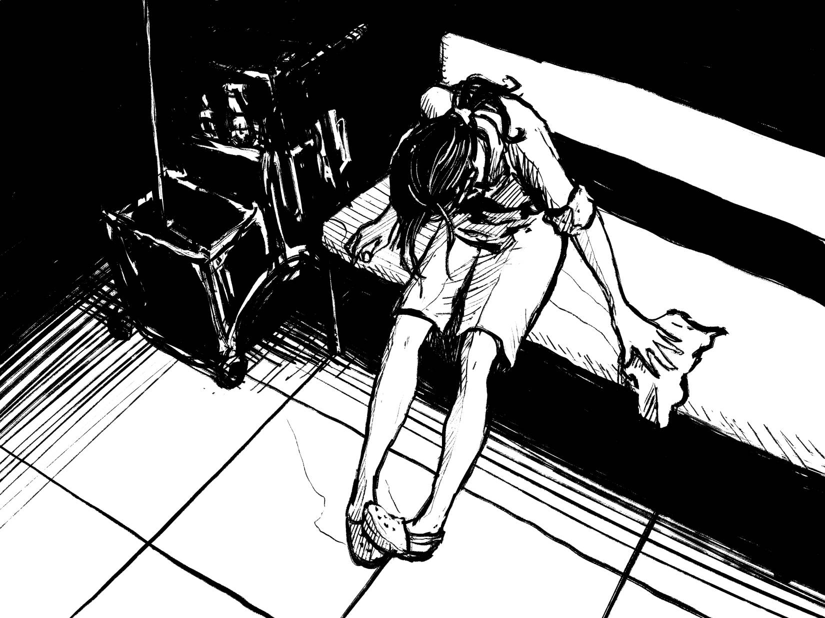 Я наконец вспоминаю о том, что вообще-то работаю здесь уборщицей, включаю на айподе первый трек, надеваю перчатки, подтягиваю ближе свою тележку, бросаю в ведро с водой пару хлорных таблеток, брызгаю стены дезинфицирующим спреем, отжимаю веревочную швабру и тру пол.